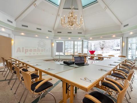 Unser Tagungsraum "Alpensonne" befindet sich im Haus Alpensonne und verfügt über Tageslicht, dimmbare Raumbeleuchtung, Verdunkelung und integrierter Raumbeschallung. Die Lage des Raumes ist sehr ruhig (Richtung Wald - Südlage). Das Haus Alpensonne ist unterirdisch mit unserem Haupthaus Hubertus verbunden. Direkt am Raum befindet sich eine Terrasse für Kaffeepausen oder Gruppenarbeiten mit direktem Zugang zur umliegenden Wiese.